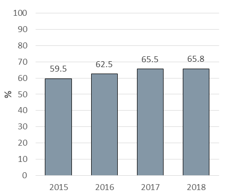 2015-2018 წლების განმავლობაში წყალმომარაგების სისტემაზე მიერთებული მოსახლეობის რაოდენობა გაიზარდა 10.4%-ით. ამავე პერიოდში, წყალმომარაგების მაგისტრალური ქსელის რეაბილიტაციის შედეგად, დანაკარგები წყლის ტრანსპორტირებისას შემცირდა 20.6%-ით. მიუხედავად ამისა, 2018 წელს, წყალმომმარაგებელი საწარმოების მიერ წყალმომარაგების სისტემაში გაშვებული წყლის დანაკარგი 65%-ს შეადგენს.დიაგრამა 1 - წყალმომარაგების სისტემაზე მიერთებული მოსახლეობის რაოდენობა საქართველოში (2015-2018)