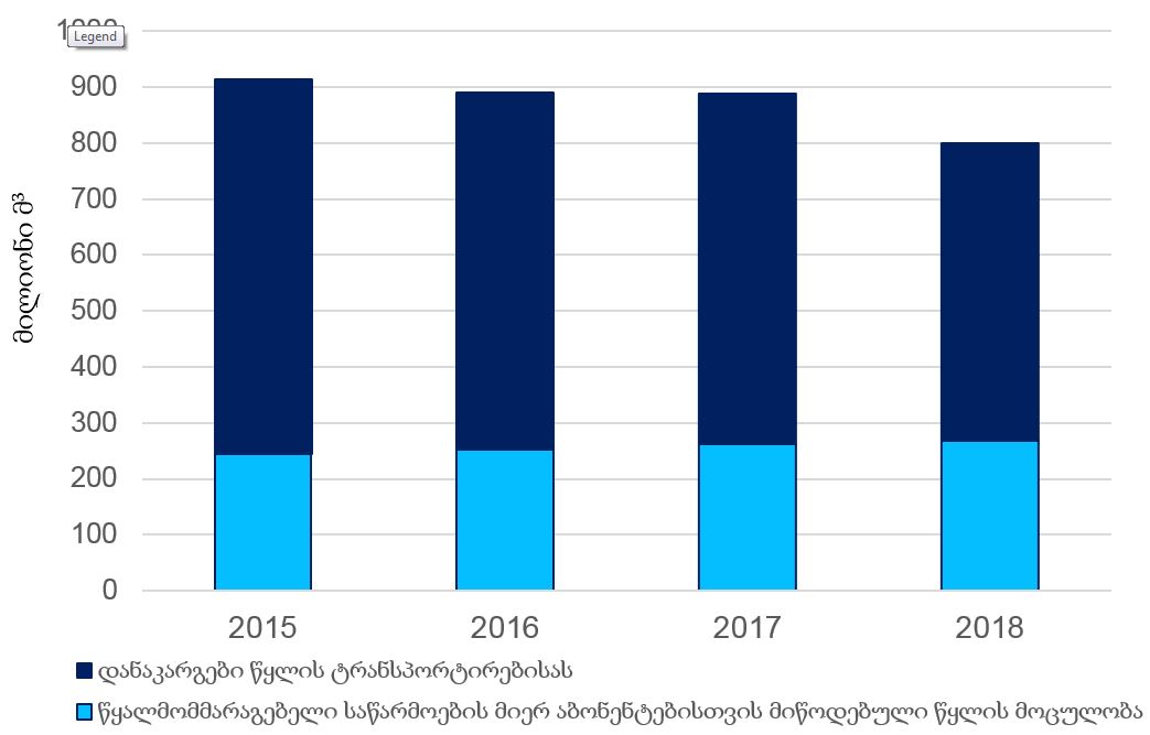 2018 წელს, წყალმომმარაგებელი საწარმოების მიერ წყალმომარაგების სისტემაში გაშვებული წყლის მოცულობამ შეადგინა 800 მილიონი მ3, საიდანაც 531 მილიონი მ3 წყალი დაიკარგა ქსელში, ეს უკანასკნელი წარმოადგენს სისტემაში გაშვებული წყლის 66%-ს. ადეკვატური სარემონტო და ტექნიკური მოვლის ნაკლებობისა და წყლის ობიექტების მოდერნიზაციაში ინვესტირებისათვის საჭირო სახსრების დეფიციტის გამო გაუარესდა წყლის სექტორის ინფრასტრუქტურა (UNECE, 2016).
