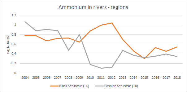 ჟბმ-სთან შედარებით ამონიუმის საშუალო კონცენტრაცია უფრო მკვეთრად შემცირდა (50%-ით მთელი ქვეყნის მასშტაბით). ყველაზე მეტად, ეს შემცირება დაფიქსირდა კასპიის ზღვაში ჩამდინარე მდინარეებში (62%).