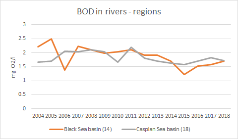მითითება: 2004-2018 წლების პერიოდში, ჟბმ-სა (მგO2/ლ) (ზედა დიაგრამებზე) და ამონიუმისთვის (მგNH4-N/ლ) (ქვედა დიაგრამებზე) არსებული მონაცემთა სერიები ორი აუზის (შავი ზღვის და კასპიის ზღვის) მიხედვით და ასევე, მთელი ქვეყნის მასშტაბით, მიღებულია მათი საშუალო წლიური კონცენტრაციების საშუალო მაჩვენებლების გაანგარიშებით. მდინარეთა მონიტორინგის წერტილების რაოდენობა, საიდანაც მონაცემებია მიღებული, მითითებულია ფრჩხილებში.