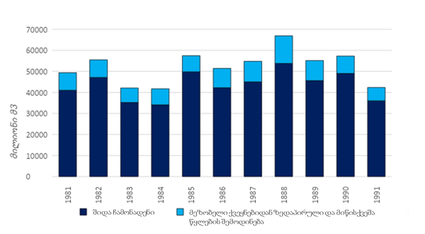 1981-1991 წლებში საშუალოდ 35 000 მილიონი მ³ წყალი გაედინა საქართველოს ტერიტორიიდან ზღვაში (რაც მთლიანი გადინების 75% -ს შეესაბამება) და 10 000 მილიონი მ³ წყალი (25%) გაედინა მეზობელ ქვეყნებში. თუმცა, ეს რიცხვი უკვე მოძველებულია და არსებული მდგომარეობა უცნობია არასაკმარისი მონაცემების გამო.
